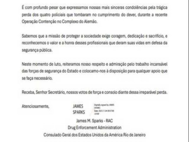 "É com profundo pesar que expressamos nossas mais sinceras condolências pela trágica perda dos quatro policiais que tombaram no cumprimento do dever, durante a recente Operação Contenção no Complexo do Alemão. Sabemos que a missão de proteger a sociedade exige coragem, dedicação e sacrifício, e reconhecemos o valor e a honra desses profissionais que deram suas vidas em defesa da segurança pública", diz um trecho do documento, assinado por James Sparks.